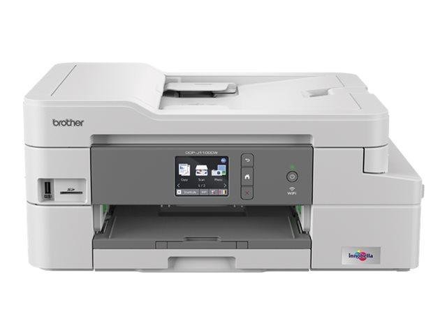 Brother DCP-J1100DW Tintenstrahl-Multifunktionsdrucker ( A4, 3-in-1, Drucker, Scanner, Kopierer, USB, Wi-Fi ) Ultra-XL-Tintenpatronen Die hohen Reichweiten der Ultra-XL-Tintenpatronen von bis zu 6.000 Seiten bei der Schwarzpatrone und bis zu 5.000 Seiten (gemäß ISO/IEC 24711) je Farbpatrone sorgen für entspanntes und unterbrechungsfreies Arbeiten von bis zu 3 Jahren. Einzelblatteinzug Über den Einzelblatteinzug kann selbst Papier von bis zu 300 g/m² verarbeitet werden. Mobile Connect Nutzen Sie verschiedenste Möglichkeiten über Ihre mobilen Endgeräte zu drucken oder darauf zu scannen. Kostenlose App Brother iPrint&Scan für Apple iOS (iPhone, iPad, iPad mini, iPod touch), Android Smartphones und Tablets, Windows Phone und Kindle Fire AirPrint zum Drucken von iPhone, iPad, iPad mini, iPod touch Google Clo…